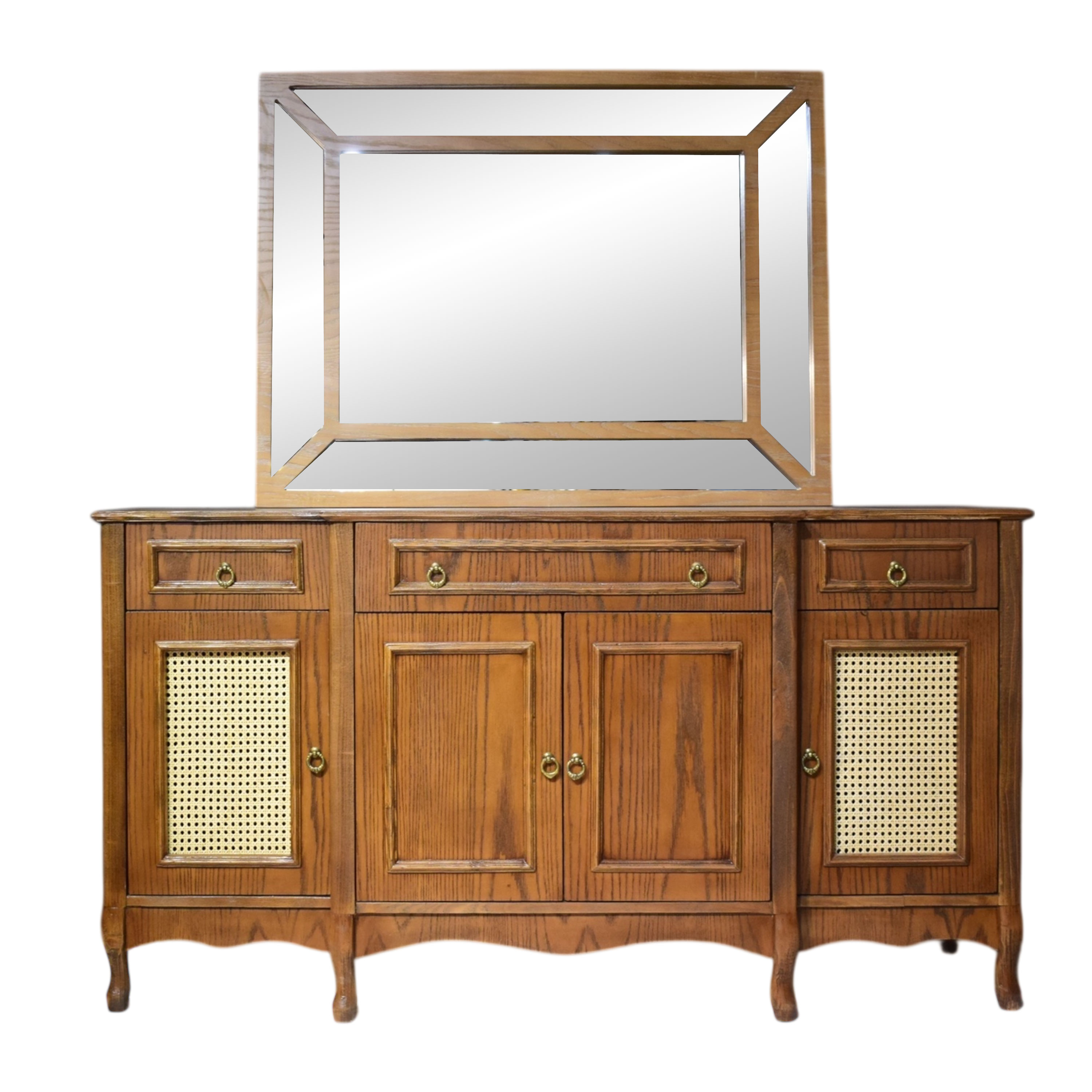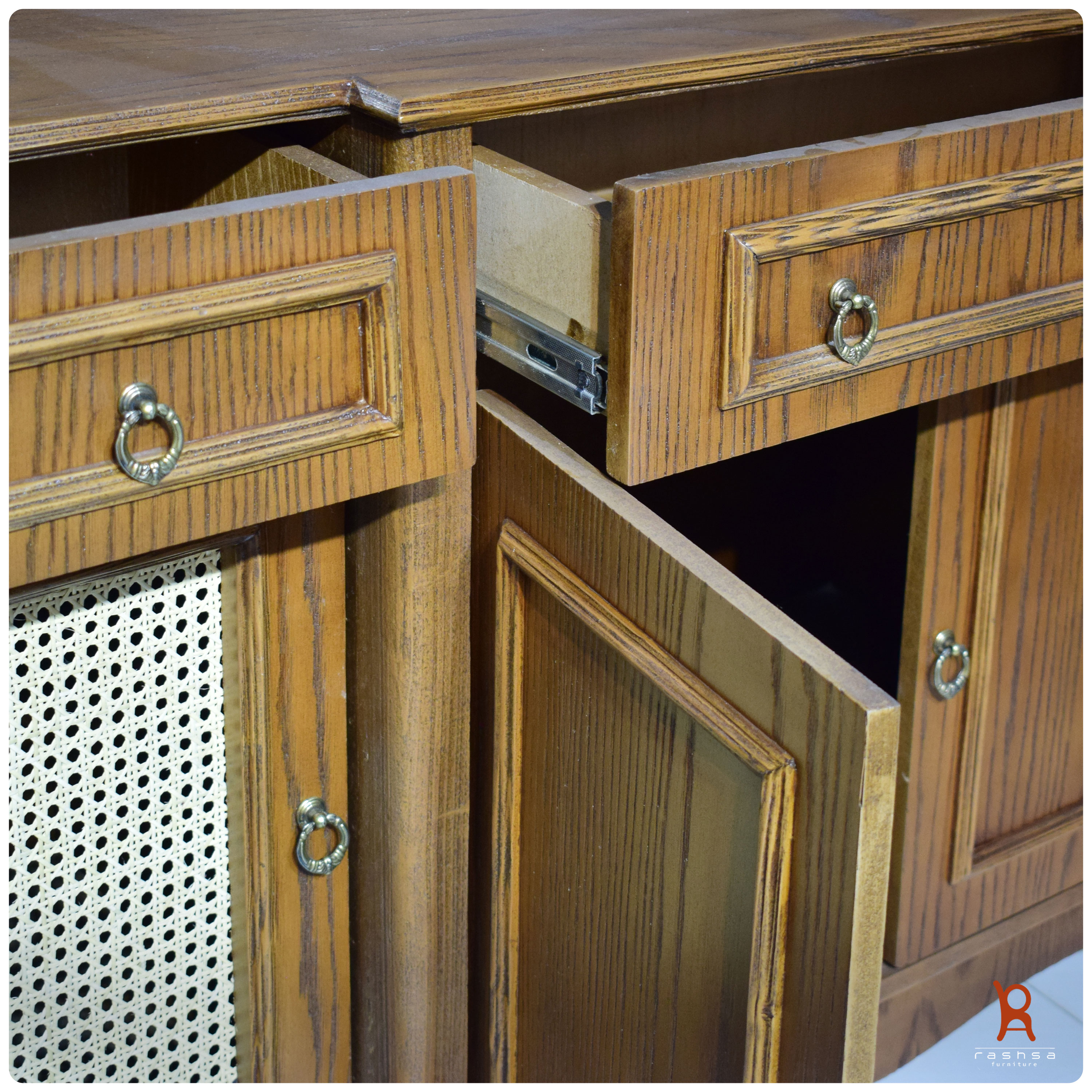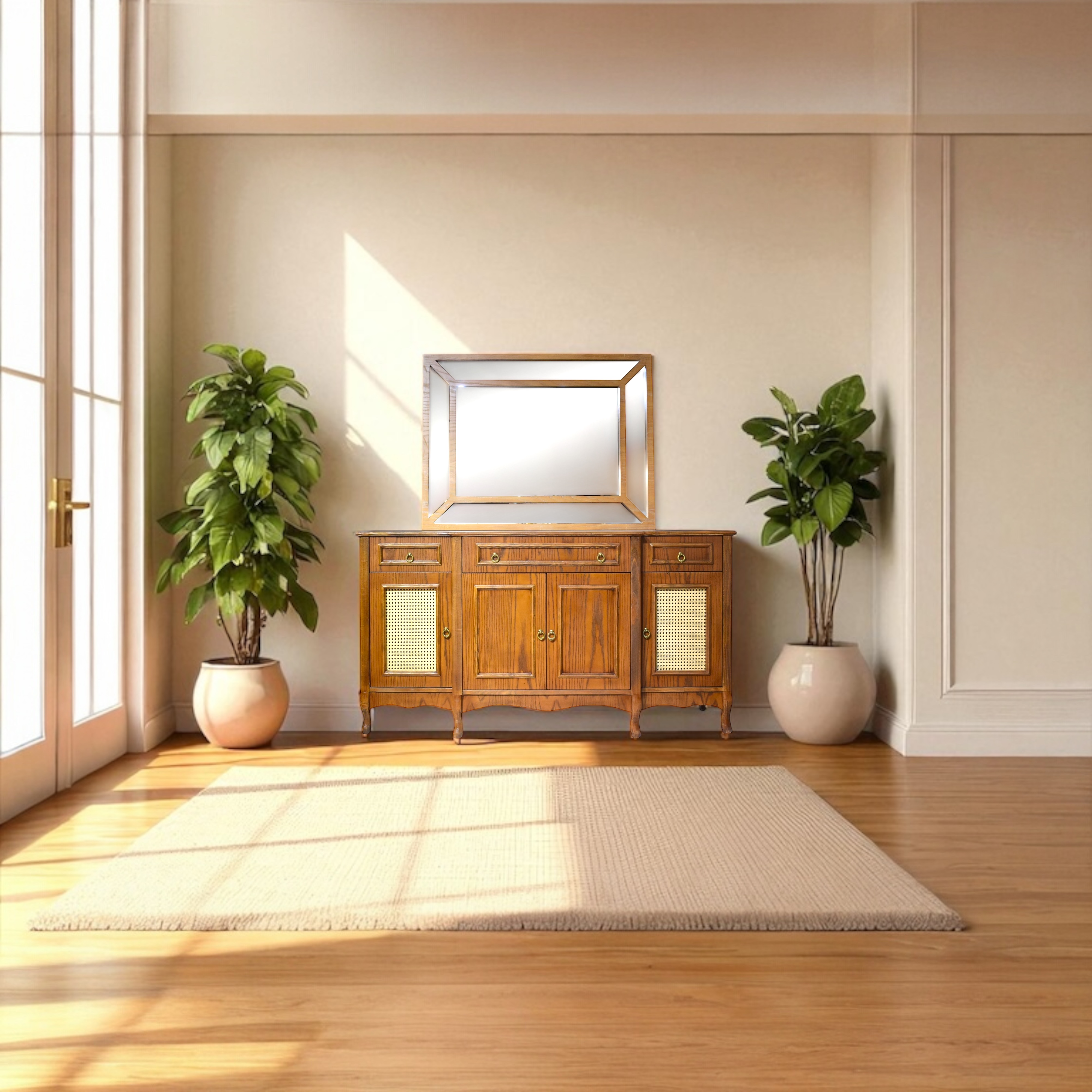 ترکیب منحصربهفرد چوب بافتدار، دربهای حصیربافت دستساز و آینهی بزرگ طراحیشده، حضور گرم و باشکوهی در فضای پذیرایی یا نشیمن شما ایجاد میکند.