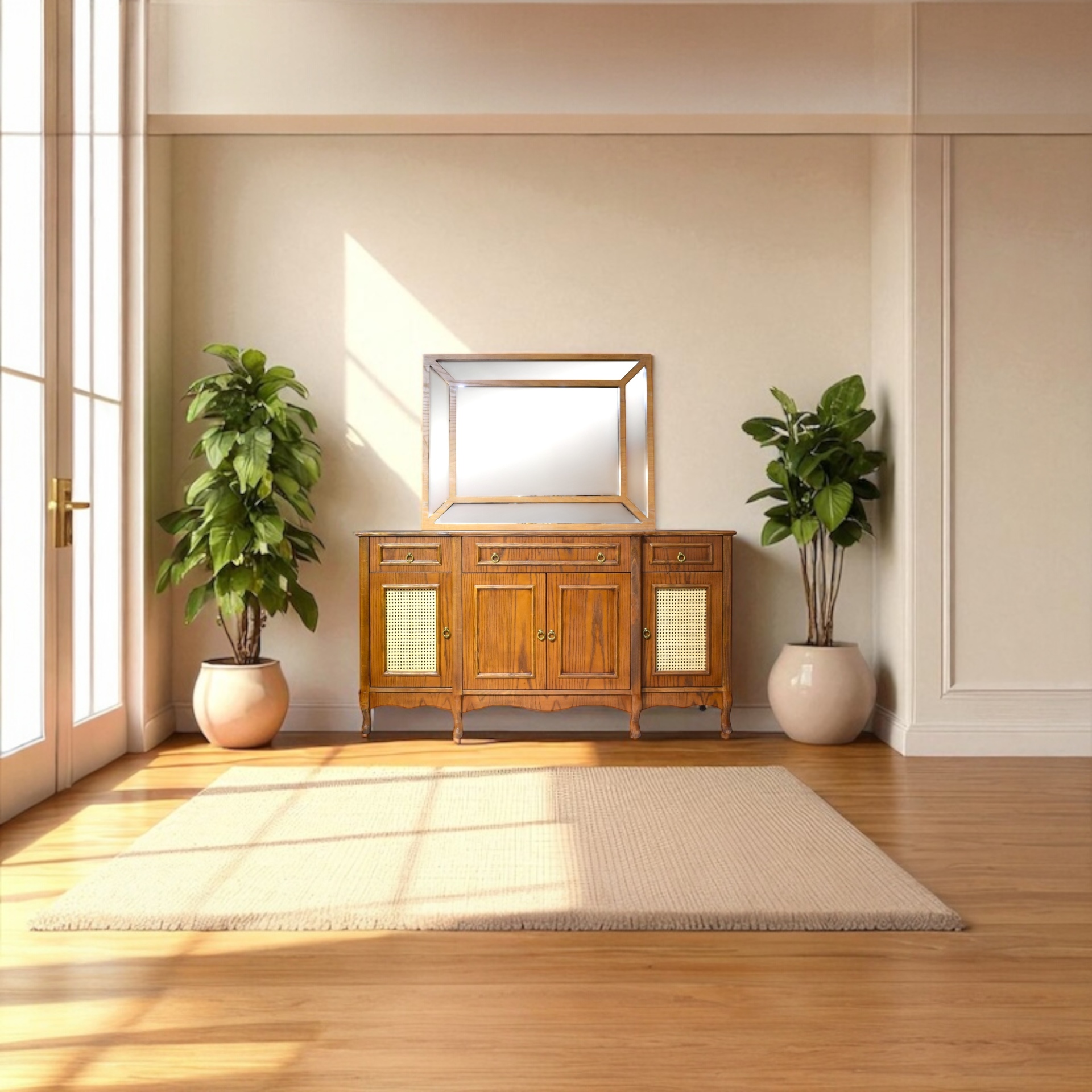 ترکیب منحصربه‌فرد چوب بافت‌دار، درب‌های حصیربافت دست‌ساز و آینه‌ی بزرگ طراحی‌شده، حضور گرم و باشکوهی در فضای پذیرایی یا نشیمن شما ایجاد می‌کند.